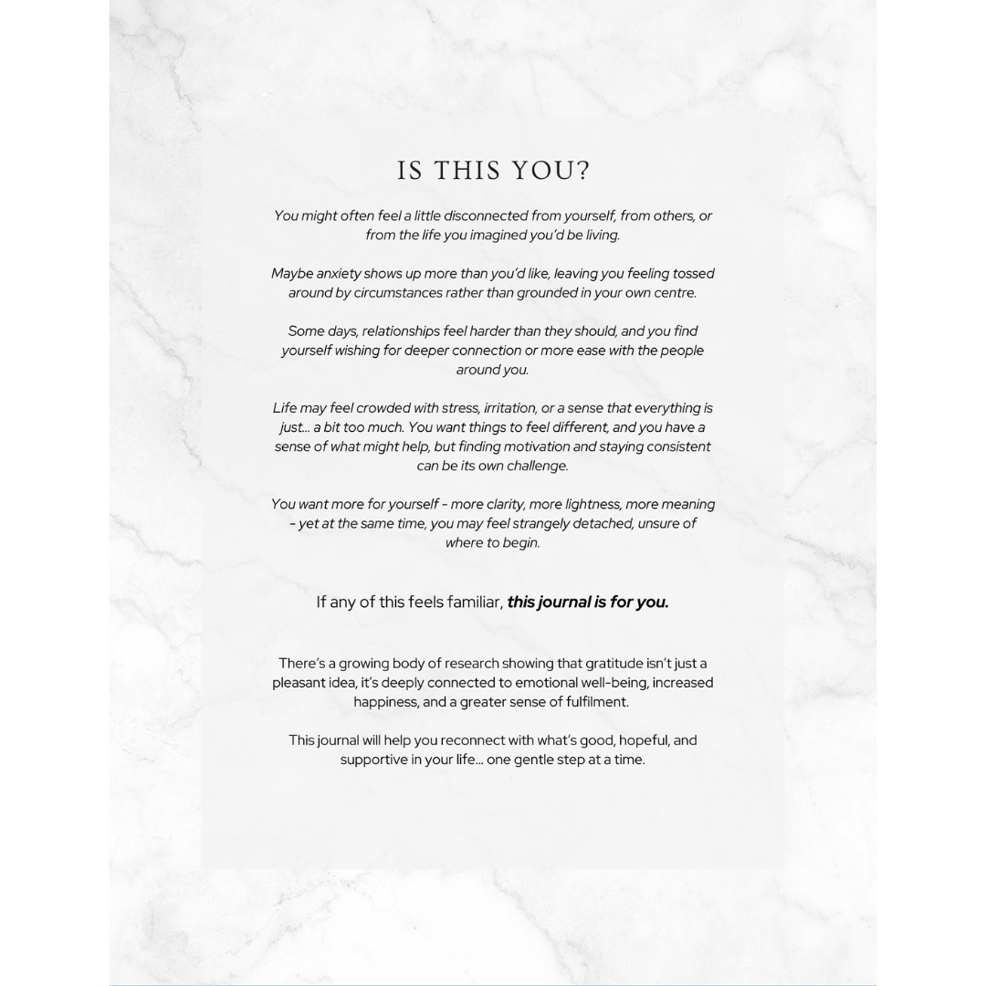 A calm structure you can complete in a few quiet minutes a day, helping gratitude grow into something you feel, not just something you write down.